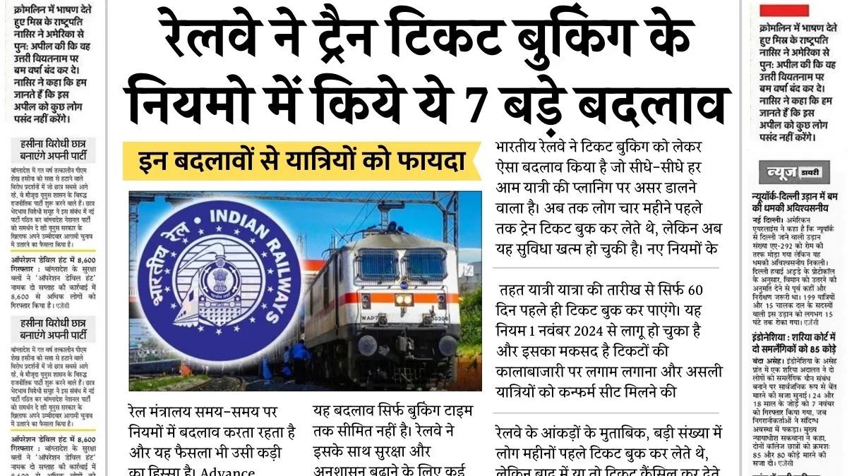 1 नवंबर 2024 से लागू नए नियमों के तहत अब यात्री सिर्फ 60 दिन पहले ही टिकट रिजर्व कर सकते हैं। इस बदलाव का सीधा असर त्योहारों, छुट्टियों और पीक सीजन में यात्रा करने वाले यात्रियों पर पड़ेगा। रेलवे का उद्देश्य टिकट सिस्टम को अधिक पारदर्शी बनाना और कन्फर्म टिकट मिलने की संभावना बढ़ाना है, ताकि यात्रियों का अनुभव बेहतर हो।